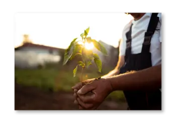 Caption: Eine Person hält eine kleine Pflanze vor Sonnenuntergang auf einem Feld in den Händen.