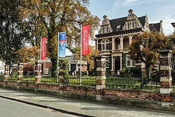 Caption: Ein historisches Gebäude mit auffälliger Fassade und drei roten Fahnen davor steht hinter einem Zaun an einer Straße.