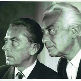 Caption: Zwei ältere Männer im Anzug stehen nebeneinander und schauen in die gleiche Richtung.
