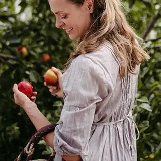 Caption: Eine Frau pflückt lächelnd Äpfel von einem Baum und hält einen Korb in der Hand.