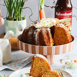 Caption: Ein Gugelhupf-Kuchen steht dekorativ auf einer Tortenplatte mit einer Flasche Saft und Osterdekoration im Hintergrund.