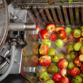 Caption: Frische Äpfel werden maschinell gewaschen, vermutlich in einer Saftproduktion.