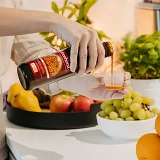 Caption: Eine Person gießt einen Saft aus einer Flasche in ein kleines Glas, im Hintergrund liegen frische Früchte.