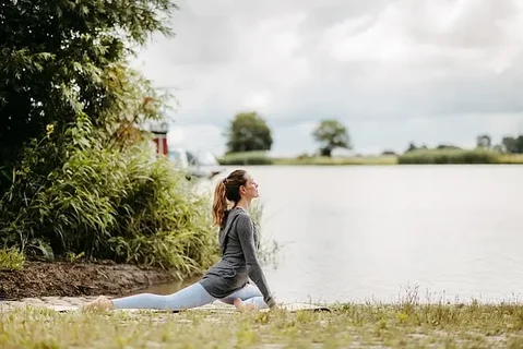 Caption: Eine Frau macht draußen am See eine Yogaübung auf einer Matte.