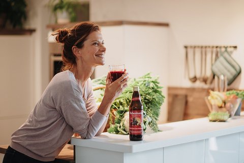 Caption: Eine lächelnde Frau lehnt an einer Küchenzeile und hält ein Glas roten Saft in der Hand, vor ihr steht eine Flasche Saft.